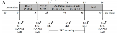如圖1A所示,受試者到達實驗室后會先休息20分鐘。在休息時間的最后5分鐘,使用積極和消極情緒量表(PANAS)和狀態-特質焦慮量表(SAI)評估受試者的情緒狀態和焦慮水平。同時進行腦電圖準備。在TSST(T1)前收集第一次唾液樣本和自我報告壓力(SR)問卷(Likert量表),建立基線。隨后,受試者進行了15分鐘的TSST或安慰劑TSST。在TSST (T2)后立即采集第二組唾液樣本并收集問卷(SR、PANAS、SAI)數據。接下來休息10 min(rest 1),在這個階段對受試者進行重復經顱磁刺激,并在之后采集第三份唾液樣本和SR。接下來是4個額外獨特刺激任務,每個大約持續7分鐘。在T4和T5采集唾液樣本和SR。在第二次休息15分鐘(rest 2)后,進行第三次SAI和PANAS問卷調查(T6)。