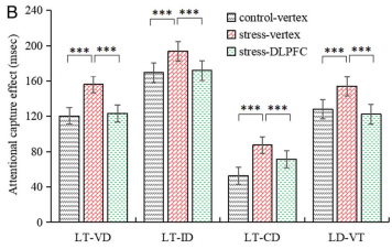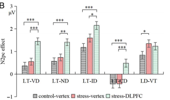 與對照組相比,LT-VD、LT-ND、LT-ID和LT-CD條件中壓力DLPFC的N2pc效應顯著增加(p < 0.001),而LD-VT條件中N2pc效應不顯著(p = 0.090)。