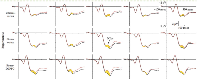 與壓力頂葉組相比,壓力DLPFC條件的N2pc效應比LT-ND條件(p = 0.002),LT-ID條件(p = 0.028)和LT-CD條件(p < 0.001)更強(p < 0.001) 。