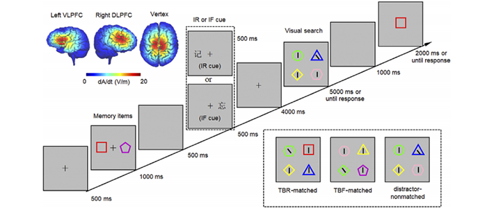 受試者進行WM-DF任務的練習(32個試次)。短暫休息(5分鐘)后,受試者接受約12.2 min的高頻rTMS。之后,受試者執行約45分鐘的WM-DF任務。