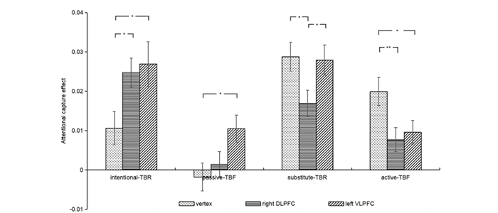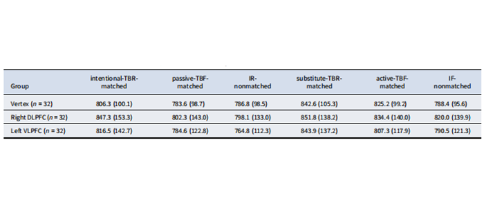 注:經顱磁刺激分別作用于左腹外側前額葉皮層(VLPFC)、右背外側前額葉皮層(DLPFC)和頂點區。利用SimNIBS軟件對模擬電場進行了圖示。紅色方塊在IR條件下作為有意TBR項目,在IF條件下作為替代TBR項目。紫色五角形作為被動TBF或主動TBF項目。